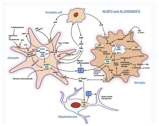 More recent investigations using rodent astrocytes confirmed that exposure to Aβ1–42 or LPS inhibited the autophagy/lysosome function while activating the NLRP3/ASC/caspase-1/IL-1β pathway. However, the administration of rapamycin or 17β-estradiol (E2) or progesterone rescued autophagic activity while curbing the Aβ1–42- and LPS-activated NLRP3/caspase-/IL-1β pathway in the astrocytes. By contrast, 3-methyladenine, a specific autophagy inhibitor, blocked progesterone’s neuroprotective effects and drove astrocytes’ NLRP3 inflammasome activation and neuroinflammation [,].