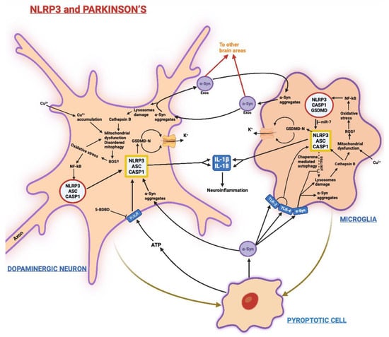 - Panicker, N.; Kam, T.I.; Wang, H.; Neifert, S.; Chou, S.C.; Kumar, M.; Brahmachari, S.; Jhaldiyal, A.; Hinkle, J.T.; Akkentli, F.; et al. Neuronal NLRP3 is a parkin substrate that drives neurodegeneration in Parkinson′s disease. Neuron 2022, 110, 2422–2437.e9. [Google Scholar] [CrossRef]