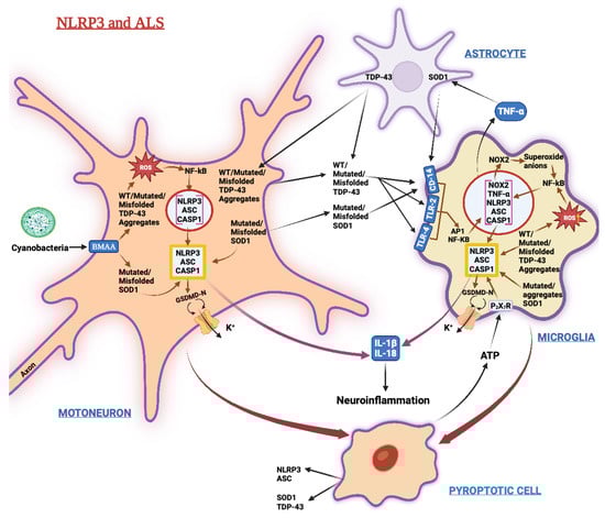 - Van Schoor, E.; Ospitalieri, S.; Moonen, S.; Tomé, S.O.; Ronisz, A.; Ok, O.; Weishaupt, J.; Ludolph, A.C.; Van Damme, P.; Van Den Bosch, L.; et al. Increased pyroptosis activation in white matter microglia is associated with neuronal loss in ALS motor cortex. Acta Neuropathol. 2022, 144, 393–411. [Google Scholar] [CrossRef]