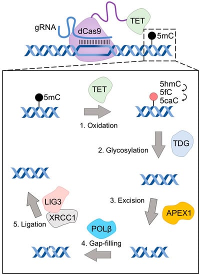 - Devesa-Guerra, I.; Morales-Ruiz, T.; Pérez-Roldán, J.; Parrilla-Doblas, J.T.; Dorado-León, M.; García-Ortiz, M.V.; Ariza, R.R.; Roldán-Arjona, T. DNA Methylation Editing by CRISPR-guided Excision of 5-Methylcytosine. J. Mol. Biol. 2020, 432, 2204–2216. [Google Scholar] [CrossRef]