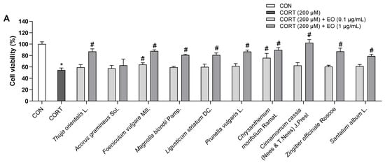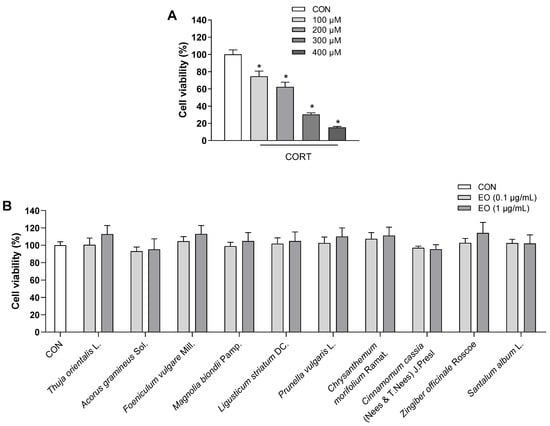 Effects of (A) CORT and (B) essential oils on the viability of PC12 cells. Results are presented as means ± SDs (n = 3 per experiment). * p < 0.05 vs. CON.