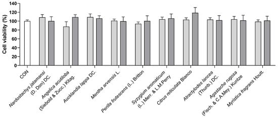 BV2 cells (an immortalized mouse microglial cell line) were cultured in Dulbecco’s Modified Eagle Medium (DMEM) supplemented with 10% FBS (Merck KGaA, Darmstadt, Germany) and 1% penicillin-streptomycin (Thermo Fisher Scientific, Waltham, MA, USA) at 37 °C in a 5% CO2 humidified environment. For the cell viability assay, BV2 cells were treated with the SDE extract of each essential oil (0.1 or 1 μg/mL). To test the anti-neuroinflammatory effects of the essential oils, BV2 cells were pretreated with non-toxic doses of each herb extract for 6 h and then stimulated with lipopolysaccharide (LPS) (1 μg/mL) for 18 h.
