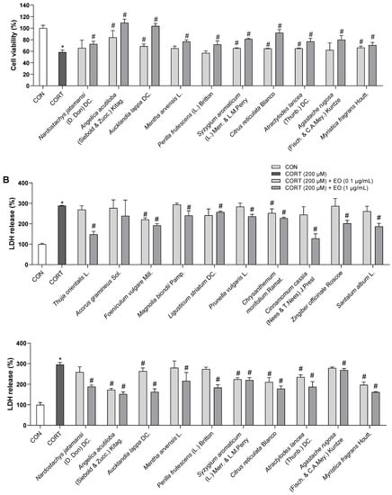 Effects of essential oils on CORT-induced neurotoxicity in PC12 cells. (A) Effects of essential oils on the cell viability in CORT-stimulated PC12 cells. (B) Effects of essential oils on the LDH release in CORT-stimulated PC12 cells. Results are presented as means ± SDs (n = 3 per experiment). * p < 0.05 vs. CON, # p < 0.05 vs. CORT-treated cells.