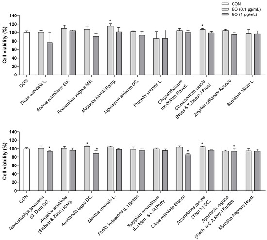 Effects of essential oils on the viability of BV2 cells. Results are presented as means ± SDs (n = 3 per experiment). * p < 0.05 vs. CON.