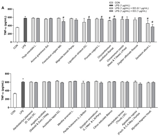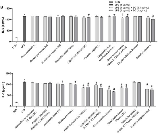 Effects of essential oils on LPS-induced neuroinflammation in BV2 cells. (A) TNF-α levels (pg/mL). (B) IL-6 levels (pg/mL). Results are presented as means ± SDs (n = 3 per experiment). * p < 0.05 vs. CON, # p < 0.05 vs. LPS-treated cells.