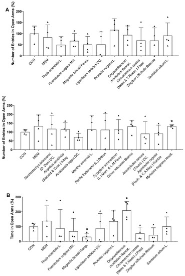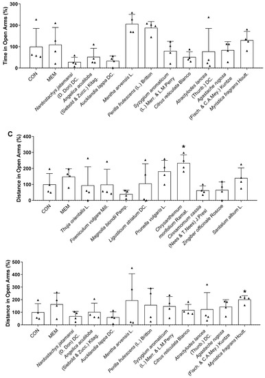 Effects of essential oils on the behavioral changes of mice in EPM test. The (A) number of entries, (B) time, and (C) distance in open arms were recorded. Each black triangle indicates the value of each mouse subject in groups. Results are presented as means percentage relative to control ± SDs (n = 4 mice per group). * p < 0.05 vs. CON.