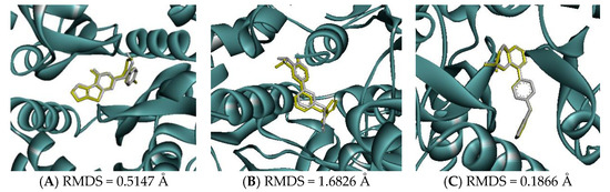 Superimposed zoomed-in image of native ligand and redocked native ligand in the active site of (A) GluN1, (B) GluN2B, and (C) GluA2 (native ligand: gray color, redocked ligand: yellow color).