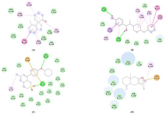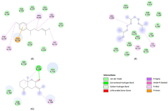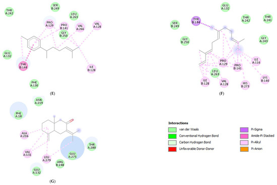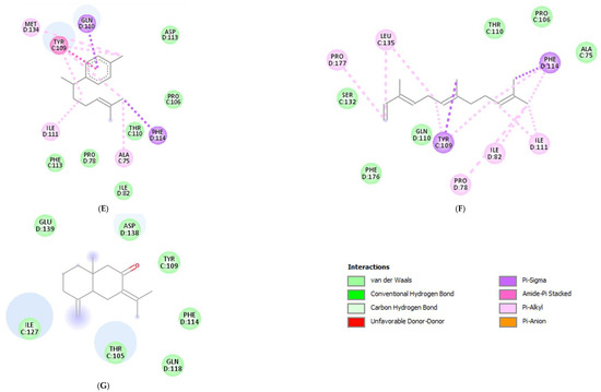 2D interactions between (A) ketamine, (B) ifenprodil, (C) TAK-653, (D) atractylon, (E) α-curcumene, (F) α-farnesene, and (G) selina-4(14),7(11)-dien-8-one with GluN1 protein.