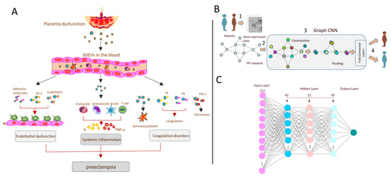 Prediction of preeclampsia from systemic inflammation through deep learning methods. (A) The main dysfunctions and disorders related to preeclampsia. As shown, SDEV release in the blood through placental dysfunction might affect endothelial cells, immune cells and the coagulation process, which might lead to preeclampsia disorder. In this study, only one of the pathways related to systemic inflammation was studied. (B) Graph of the convolutional neural network (GCNN) summary. Microarray expression data were taken from patients, and normal samples were used to build the IL-4 and IL-13 pathway graph. Then, convolutional and pooling layers were applied for classification. (C) The structure of the multilayer perceptron (MLP) model. The model contains three hidden layers with ReLUs as the activation functions for all of them. The input layer also contains 111 units representing all 111 genes linked to the mentioned pathway.