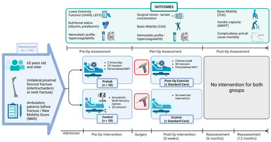 Graphical illustration of the study design. In the frame “outcomes”, only the first integration of the assessments and not the follow-up assessment can be seen. For example, mHHS will be assessed not only at admission (first integration as shown in the box) but also at 4, 8, 26 and 52 weeks (follow-up assessment). Accordingly, the evaluation of the basic mobility through the CAS scale will be evaluated on the first; second and third postoperative day and at 4, 8, 26 and 52 weeks postoperatively. Blood samples will be collected on the day of admission; one day before surgery; on the third postoperative day and at 1, 4, 8, 26 and 52 weeks postoperatively. Analysis of the coagulation biomarkers will be done by ROTEM. After the 8 weeks of postoperative intervention, there will be no intervention for any of the two groups. The time from admission to surgery will vary. Created with BioRender.com (accessed on 16 April 2023). Abbreviations: MIIT = Moderate Intensity Interval Training; CAS = Cumulative Ambulation Score; 6MWT = six-minute walk test; TUG = Timed-Up and Go; mHHS = modified Harris Hip Score; LEFS = Lower Extremity Functional Scale; NMS = New Mobility Score; La = Lactate concentration of capillary blood; ROTEM = rotational thromboelastometry; Hemostatic profile = tissue Plasminogen Activator (tPA); Plasminogen Activator Inhibitor-1 (PAI-1); Endogenous Thrombin Potential (ETP); Fibrinogen; D-dimers; von Willebrand factor antigen; von Willebrand factor activity; Thrombin–Antithrombin Complex (TAT); Thrombomodulin; platelet function—PFA-100; hemostatic profile using viscoelastic techniques—ROTEM; pre-op = preoperative; peri-op = perioperative; post-op = postoperative.
