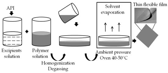 In SCM, APIs and other ingredients are first dissolved in other solvent portions and combined later with polymer mass. The formulation mixing may inadvertently introduce air bubbles, so mixture deaeration is a prerequisite for a homogeneous, clear product. The trapped air is removed by centrifugation, vacuum or sonication, and the resulting solution/dispersion is cast into the mold. Finally, the solvent is allowed to evaporate at atmospheric pressure. Evaporation can be done in an oven or a dryer and on a hotplate, often at 40–50 °C, leading to faster solvent removal and forming a thin-film carrier with the drug incorporated (Figure 1). It is important to note that the cast film may retain some casting solvent after drying, contributing to its plasticization. The dried film is then cut into pieces of the desired size and adequately packaged. Finally, the resulting film carrier should not be exposed to ambient conditions for a prolonged period due to its susceptibility to drying, evaporation of the residual solvent and reduced flexibility, as well as to mechanical damage in the form of chipping or micro-cracking [,,]. The quality of the final product prepared by solvent casting is influenced by the properties of the polymers used to prepare the casting compounds, such as molecule structure, transverse dimension, chain length and flexibility. With increased molecular weight and the number of polymer branches, the materials become more mechanically robust, harder, rigid and resistant to cracking [,].