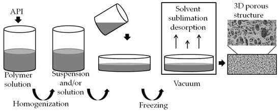 Lyophilization is a multi-step process involving substrate freezing at atmospheric pressure, pre-drying (sublimation) and drying (desorption) under reduced pressure (vacuum) (Figure 2). Compared to the solvent-casting method, which is carried out under atmospheric pressure at room temperature or higher, the parameters affecting the quality of the final product are more precisely controlled and monitored throughout the freeze-casting process. Maintaining optimum parameters, e.g., temperature and pressure in the chamber during the entire desiccation, results in carriers with desired and reproducible characteristics and high rehydration capacity. In addition, removal of the desired amount of solvent does not require increasing the temperature, eliminating thermal effects that can affect the stability of thermally sensitive substances such as peptides and protein drugs [].
