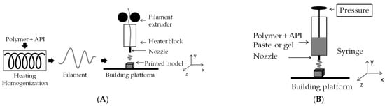 Three-dimensional printing, fused deposition modelling (A) and semi-solid extrusion (B) method.