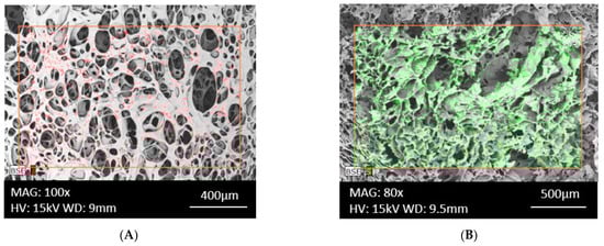 Surface porosity, heterogeneity and roughness are significant aspects in studying materials and correspond to the volume of void space, which may contain fluid or air, relative to the total volume of the material. The morphology of the porous structure influences its water-related properties, such as the degree of swelling and matrix leaching. The larger pore volume and porous structure facilitate water uptake into the matrices []. Pore size and homogeneity affect the biological activity of the produced matrices. For example, matrices with homogeneous porosity are more rapidly absorbed and biodegraded than carriers with less homogeneous structures []. The porous structure of the material influences a number of matrix properties, such as sorption capacity and mechanical properties. The pore system can be classified due to its accessibility to the environment into closed and open and the following geometrical shapes: cylindrical, bottle-shaped, slit-shaped and conical []. The process of adsorption of gas molecules (adsorbate) onto the exposed surface of a dry material (adsorbent) is used to study the estimation of pore size distribution. A gaseous adsorbate, i.e., argon, krypton, helium or polar liquids such as water vapor, is used to penetrate the pores and, depending on the type of gas, adsorption allows the pore size to be assessed starting from ca. 0.35–100 nm. In practice, nitrogen at a constant temperature of 77 K as the boiling point of the gas is most commonly used to describe the surface of mesopores with a diameter of 2–50 nm and macropores with a diameter of less than 100 nm. When gradually increasing the partial pressure in the predicted range value, the amount of adsorbed gas is measured, and an adsorption isotherm is plotted. Likewise, when decreasing the pressure, the amount of gas removed is measured, and a desorption isotherm is obtained. Based on the defined adsorption isotherm, the amount of gas adsorbed in the monolayer region of the sample is calculated and, based on equations relating to the pressure at which condensation or evaporation of the adsorbate occurs on the surface of the adsorbent, the pore size distribution of the matrix is estimated. The Brunauer–Emmett–Teller (BET) method is used to measure porosity surface area and calculate the mean pore radius, pore size distribution and total pore volume from the adsorption isotherm. The BET Equation (1) assumes a cylindrical pore shape, and the amount of adsorbed liquid in the gaseous state as a volume is expressed as