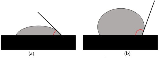 where γlv, γsv and γsl represent the liquid–vapor, solid–vapor and solid–liquid interfacial tensions, respectively, and θY is the contact angle if the assumptions are met for the surface of the tested carrier, which should be rigid, undeformable, smooth, stationary and unable to change orientation in contact with the liquid. In addition, the surface to be tested and the liquid must not interact, i.e., show swelling or cause extraction of solid components. Importantly, as most of the assumptions for ideal contact angle measurements are violated by the actual measurement conditions, the tests must include the influence of these non-ideal conditions in the analyses. A digital goniometer connected to an image analyzer, which photographs the surface (interface) of the liquid and automatically calculates the angle, is usually used to measure the contact angle of the carriers []. In the experiment, samples of test liquids with different surface tensions, e.g., water, glycerol, etc., are applied as droplets to the solid surface of the test material. Then, the contact angle is assessed for the deposited droplets, with a contact angle θ of >90° for highly non-wettable surfaces and ∼0° for highly wettable surfaces (Figure 6).