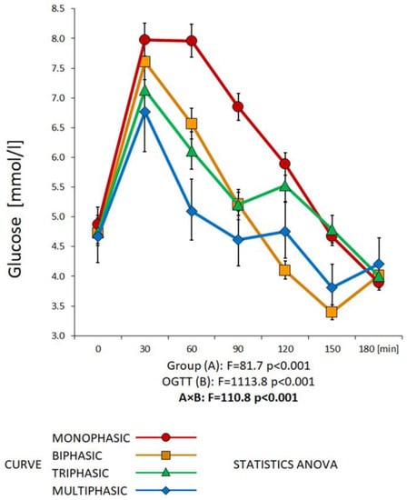 The shape of the glucose curve was classified as monophasic if glycemia simply increased and then gradually decreased (one peak). The shape was biphasic if the blood glucose showed a further increase after a previous decrease. The triphasic shape was characterized by two complete peaks. During the 3 h OGTT, much more complex and heterogeneous curve shapes were observed. In some people, there were also four- and five-phase curves with three and four complete peaks, respectively. These were pooled as multiphasic type of glycemic curves.