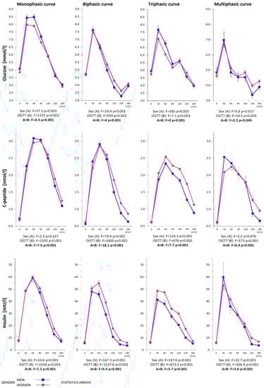 Although men and women did not differ in age, numerous metabolic gender differences were evident. In men, we observed an unfavorable profile in the lipid spectrum (lower HDL and higher LDL and triacylglycerols). In addition, systematic differences were present in the thyroid hormones and liver enzymes, showing higher levels (except TSH) in men, albeit with medians within a normal laboratory range (Table 1a). It is particularly important that men also differed from women in many parameters of glucose metabolism, especially in terms of lower glucose-induced insulin and C-peptide secretion (lower insulinemia from the 60th to 180th min, AUC ins, C-peptide from the 120th to 180th min, and AUC cp) (Table 1b). Therefore, men had also lower indices of pancreatic beta cell function (HOMA-beta, IGI, and AUC ins/AUC gluc ratio, as well as AUC cp/AUC gluc ratio), disposition indices, and the adaptation index. Hepatic extraction of insulin was higher in men (Table 1c). The course of glycemic, insulinemic, and C-peptide curves for women and men with a focus on the differences in individual times of the 3 h OGTT is shown in Figure 2. It clearly shows the higher and delayed curve of insulin secretion in women compared to men (especially in the biphasic and triphasic curves). The issue of the OGTT-derived trajectories, as well as the location of the peak of the secretory maximum, will be addressed in the following sections. Due to the systematic differences observed in the biochemical parameters between women and men, especially with regard to the differences in glucose homeostasis, we decided to maintain keeping the genders separate in the subsequent evaluation.