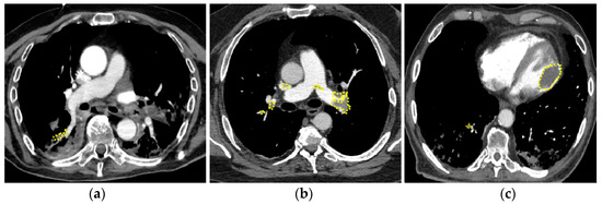 Based on CT angiography findings, we defined micro-pulmonary embolism (mPE), characterized by distal and partial filling defects in the segmental and/or subsegmental branches, and proximal or central pulmonary embolism (cPE) (Figure 1a) [28], characterized by the involvement of principal pulmonary arteries (Figure 1b). In one case, PE was associated with left ventricular thrombosis (Figure 1c).