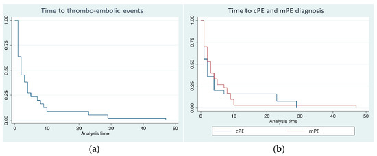 (a) Time to diagnosis of overall pulmonary embolism (PE) events from hospital admission; (b) time to diagnosis of cPE (blue line) and mPE (red line) (log-rank 0.468).