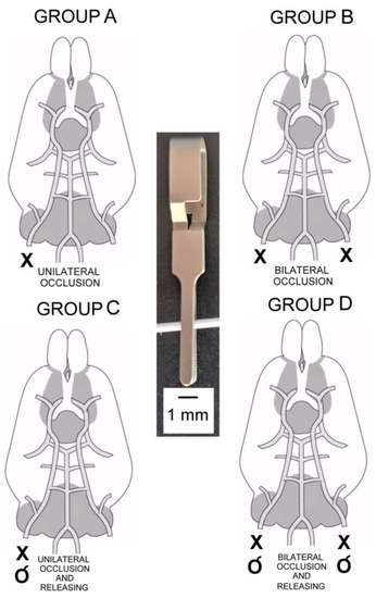 When animals were placed dorsally, the common carotid artery was dissected uni- or bilaterally, 2 mm before it splits to internal and external carotid arteries. Dissected common carotid arteries were occluded and/or released depending on the group of tested animals (Figure 1).