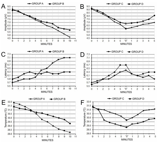 Variability of the amplitude (A,B) and latency (C,D) of the MEPs, and temperature (E,F) recorded in rats from groups A and B (left side) and C and D (right side) at various stages of observations. “0”—releasing the artery after five minutes of occlusion.