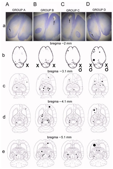 Locations of lesions resulting from the induction of ischemia with various variants found in animals from A–D groups (“X” means occlusion, while “O” is the artery releasing). Examples of microscopic images with the lesion sites marked with arrows in the four groups of animals (A–D) are shown in part “(a)” of the figure. The results of histological examinations (b–d) were re-drawn from the microscopic images and showed the location of lesions of varying severity, which are marked with circles of different diameters on the cross-sectional diagrams of the brain. In “(b)”, cross-sections are shown at the levels −2 mm from the bregma point, in “(c)“, −3.1 mm, in “(d)”, −4.1 mm, and in “(e)”, −5.1 mm. Black arrows indicate ischemic spots.