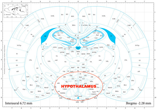 The dissection of the hypothalamus according to a stereotaxic atlas of the rat brain. Reprinted/adapted with permission from Ref. [11]. The coordinates were: rostro-caudal (RC) +2.6–−2.6 mm, medio-lateral (ML) +1.5–−1.5 mm, dorso-ventral (DV) +7–+10 mm for the hypothalamus.