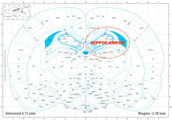 The dissection of the hippocampus according to a stereotaxic atlas of the rat brain. Reprinted/adapted with permission from Ref. [11]. The coordinates were: rostro-caudal (RC) −4.0–−6.0 mm, medio-lateral (ML) +2.0–+5.0 mm, dorso-ventral (DV) +3.0 to +8.0 mm for the hippocampus.
