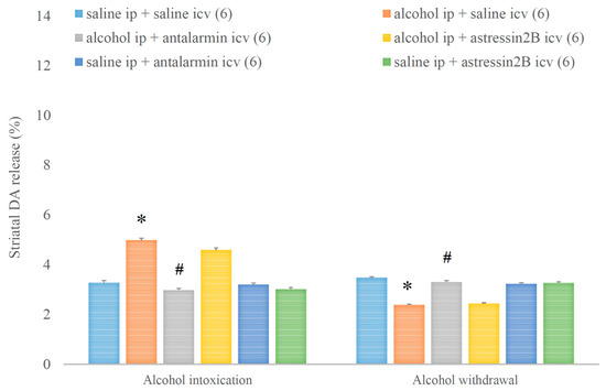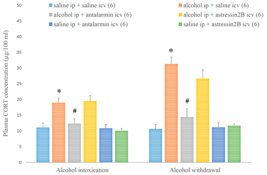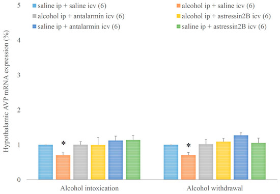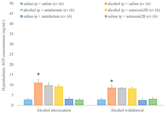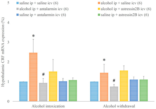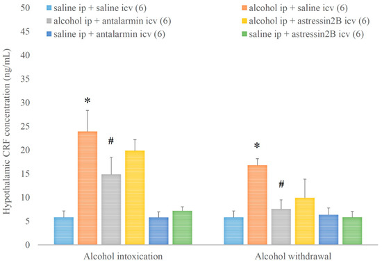 This amount of alcohol produced a blood alcohol concentration (BAC) of 197.5 ± 19 mg/dL, measured at 30 min after the ip administration [12]. On the fifth (immediately after the last ip administration of alcohol) or sixth day (24 h after the last ip administration of alcohol), the rats were administered icv with 0.1 µg/2 µL of antalarmin or 1 µg/2 µL of astressin2B. The doses of CRF1 and CRF2 antagonists were based on our previous studies, which indicated that these doses efficiently block the activation of the HPA axis and the striatal DA release observed during nicotine withdrawal [13,14]. After 30 min, the mice were decapitated without anesthesia, the trunk blood was collected, and the brains were removed. From the brain, the expression and concentration of hypothalamic CRF and AVP as well as the release of striatal DA, amygdalar GABA, and hippocampal GLU were determined. From the trunk blood, the concentration of plasma ACTH and CORT were measured.