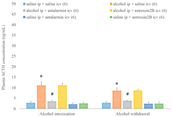 The effects of alcohol intoxication and withdrawal on the plasma adrenocorticoptropic hormone (ACTH) concentration in rats and the impacts of antalarmin and astressin2B on these effects. Values are presented as the means ± SEM; statistically significant difference was accepted for p < 0.05 and indicated with * for alcohol ip + saline icv vs. saline ip + saline icv and with # for alcohol ip + antalarmin icv vs. alcohol ip + saline icv.