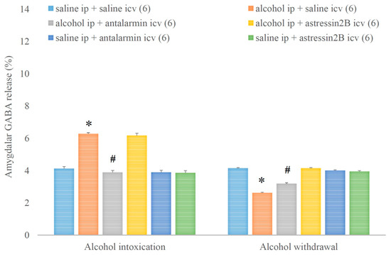 The effects of alcohol intoxication and withdrawal on the amygdalar gamma aminobutyric acid (GABA) release in rats and the impacts of antalarmin and astressin2B on these effects. Values are presented as the means ± SEM; statistically significant difference was accepted for p < 0.05 and indicated with * for alcohol ip + saline icv vs. saline ip + saline icv and with # for alcohol ip + antalarmin icv vs. alcohol ip + saline icv.