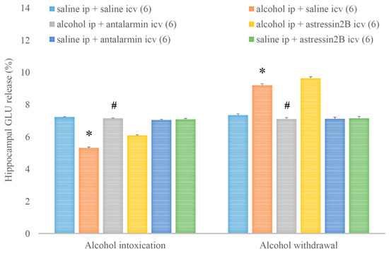 The effects of alcohol intoxication and withdrawal on the hippocampal glutamate (GLU) release in rats and the impacts of antalarmin and astressin2B on these effects. Values are presented as the means ± SEM; statistically significant difference was accepted for p < 0.05 and indicated with * for alcohol ip + saline icv vs. saline ip + saline icv and with # for alcohol ip + antalarmin icv vs. alcohol ip + saline icv.