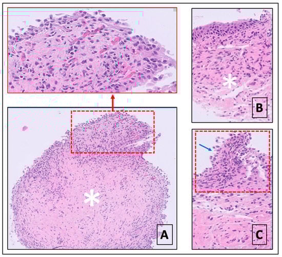 (A) Mild chronic inflammatory infiltrate and moderate fibrosis of bladder mucosa: inflammation shows a prevalent sub-epithelial distribution (dashed red line and red insert), whereas fibrosis extends deeper in the lamina propria (white asterisk). (B) Moderate interstitial fibrosis (white asterisk), without significant inflammation of the bladder mucosa. (C) Moderate inflammation (dashed red line) and transitional epithelium reactive hyperplasia (blue arrow). No interstitial fibrosis is observed.