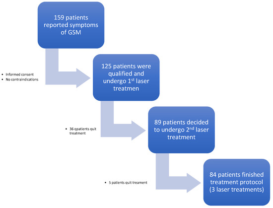 The primary study group consisted of 159 women in the postmenopausal period. The inclusion criteria were menopausal status, one or more GSM-related symptoms, and informed consent to participate in the study by the patient. The exclusion criteria were abnormal Pap smears, recurrent urinary tract infections or active genital infection, systemic steroid or hormonal use in the previous three months, pelvic organ prolapse (POP) > II, or lack of informed consent. This prospective study initially included a population of 125 patients aged 41 to 69 who reported symptoms of GSM. After the 1st laser treatment, only 89 patients decided to undergo the 2nd treatment. All of the 36 patients who left the treatment at this stage were satisfied with only one laser procedure. The whole laser therapy was finished by 84 patients, who were then evaluated as the study group (Figure 1).