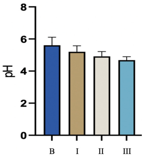 pH level before and 6 weeks after each laser treatment. B—before treatment; I—6 weeks after 1st treatment; II—6 weeks after 2nd treatment; III—6 weeks after 3rd treatment.