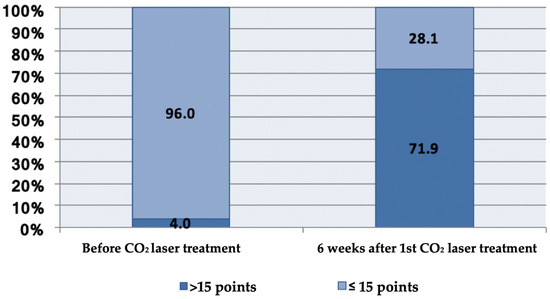 In the group of patients who underwent a full course of the therapy (three CO2 laser treatments), satisfaction levels ranged from 4.0 to 5.0, according to a 6-week follow-up evaluation after the last treatment. A total of 79.77% of patients rated their level of satisfaction as 5 (very satisfied) and 20.23% as 4 (satisfied). There were no lower scores in that group. In the studies of Salvatore et al. [1] after 12 weeks of CO2 fractional laser treatment, 42 women (84%) reported satisfaction with the procedure. There are studies where reported satisfaction with the procedure was achieved in 100% of patients [58].