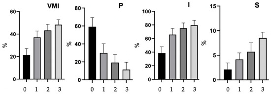 Assessment of VMI general score and particular cell percentage, after each stage of therapy. 0—before laser treatment; 1—6 weeks after 1st laser treatment; 2—6 weeks after 2nd laser treatment; 3—6 weeks after 3rd laser treatment.