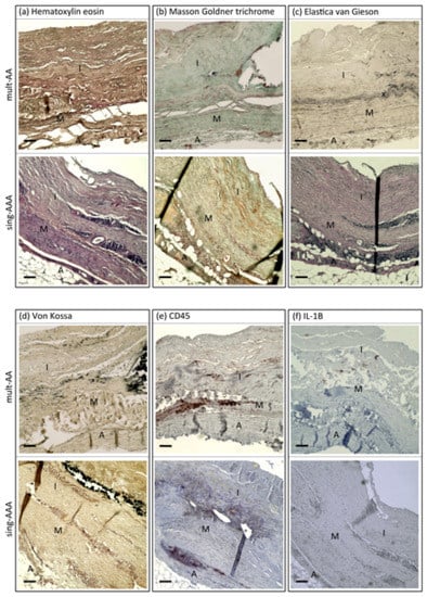 AAA wall sections of patient from mult-AA and sing-AAA groups following staining/immunohistochemistry: (a) hematoxylin eosin, (b) Masson–Goldner trichrome, (c) Elastica van Gieson, (d) von Kossa, (e) CD45 and (f) IL-1β. I = tunica intima. M = tunica media. A = tunica adventitia. x = internal elastic membrane. Scale bar, 250 µm.
