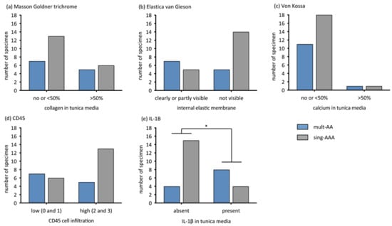 Extent of aneurysmal wall alterations compared dichotomously between mult-AA and sing-AAA groups in respective staining/immunohistochemistry by Fisher’s exact test. The y-axis describes the number of specimens. * statistical significance. (a) Extent of collagen alteration (grade 0–1 vs. grade 2). Masson–Goldner trichrome, p = 0.705. (b) Extent of internal elastic membrane alteration (grade 0–1 vs. grade 2). Elastica van Gieson, p = 0.130. (c) Extent of calcification in tunica media (grade 0–1 vs. grade 2). von Kossa, p = 1. (d) Extent of CD45-associated cell infiltration (grade 0–1 vs. 2–3), CD45. p = 0.262. (e) Extent of IL-1β expression in tunica media (grade 0 vs. grade 1). IL-1β, p = 0.022.
