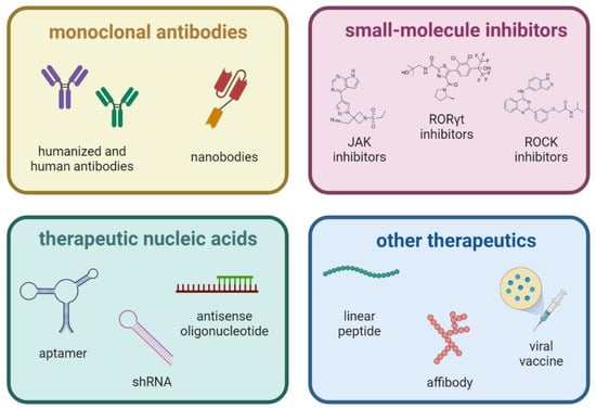 According to clinical management recommendations, inhibitors of eighter TNFα or IL-17A are the first-line biologic treatment. It has been proven that therapy with IL-17A inhibitors for at least two years influences the radiographic progression in contrast to TNFα inhibitors [3]. To date, three IL-17A-inhibitors have been registered: sekukinumab, ixekizumab, and netakimab. However, for all their benefits, such as high clinical efficacy and an acceptable safety profile for the patient, therapeutic anti-IL-17A antibodies also possess a number of limitations: immunogenicity, difficulties in transportation and storage, and high cost [33,34]. In recent years, other targeted molecules have been proposed for the purpose, such as therapeutic nucleic acids or nanoantibodies (see Figure 1).