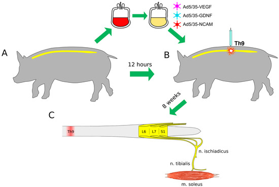 Study design. (A)—Collection of 50 mL of venous blood and preparation of the autologous genetically enriched leucoconcentrate. (B)—Spinal cord contusion injury at the Th9 segment followed by intravenous autoinfusion of the genetically enriched leucoconcentrate 4 h after surgery. At 2, 4, and 8 weeks after surgery, behavioral tests and electrophysiological studies were performed. (C)—The lumbar spinal cords (L6-S1), tibial nerves and soleus muscles were harvested at 8 weeks after injury. Ad5/35—adenovirus serotype 5 with fibers derived from adenovirus serotype 35 fiber gene; VEGF—vascular endothelial growth factor; GDNF—glial cell line-derived neurotrophic factor; NCAM—neural cell adhesion molecule.