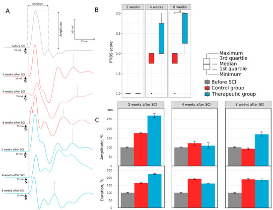Hind limb skeletal muscles recovery in mini pigs after low thoracic spinal cord injury (SCI). (A)—Motor activity of mini pigs in control and therapeutic groups at 2, 4, and 8 weeks after SCI assessed with the Porcine Thoracic Injury Behavioural Scale (PTIBS). (B)—Evaluation of amplitude and duration of motor-evoked potential (M-response) in the soleus muscle evoked by electrical stimulation of the sciatic nerve in control and treated mini pigs at 2, 4, and 8 weeks after SCI, *—p < 0.05. (C)—Analysis of the amplitude and duration of motor-evoked potential.