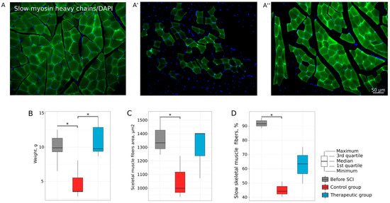 Assessment of soleus muscles in mini pigs 8 weeks after low thoracic spinal cord injury (SCI). (A,A′,A″) Cross-sections of the muscle stained with antibodies against slow myosin heavy chains (green glow) from intact, control, and therapeutic groups, correspondingly. Nuclei were counterstained with DAPI (blue glow). (B) Soleus muscle weighing analysis. (C) Morphometric analysis of skeletal muscle fiber area. (D) Relative content of slow skeletal muscle fibers, *—p < 0.05.