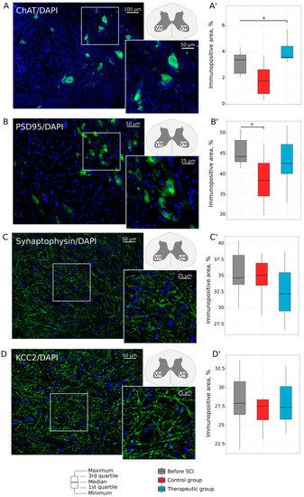 Immunofluorescence staining of the ventral horns of the lumbar spinal cord in mini pigs 8 weeks after low thoracic spinal cord injury (SCI). (A) Immunopositive reaction with an antibody against a choline acetyltransferase (Chat) (green glow) in an intact animal. (A′) Morphometric analysis demonstrates relative Chat-positive area in the experimental groups. (B) Immunopositive reaction with an antibody against a postsynaptic density protein of 95 kDa (PSD95) (green glow) in an intact animal. (B′) Morphometric analysis demonstrates relative PSD95-positive area in the experimental groups. (C) Immunopositive reaction with an antibody against a synaptic vesicle protein synaptophysin (green glow) in an intact animal. (C′) Morphometric analysis demonstrates relative synaptophysin-positive area in the experimental groups. (D) Immunopositive reaction with an antibody against a potassium-chloride cotransporter protein (KCC2) (green glow) in an intact animal. (D′) Morphometric analysis demonstrates relative KCC2-positive area in the experimental groups. Nuclei were counterstained with DAPI (blue glow). Inserts demonstrate the zooming part of images. The squares inserted in the schematic transverse spinal cord indicate the areas used for immunofluorescence analysis, VH—ventral horn. Data are visualized using box plots, *—p < 0.05.