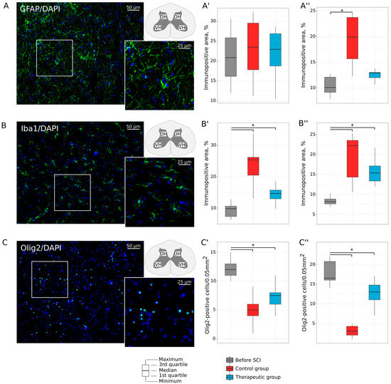 Immunofluorescence staining of the ventral and dorsal horns of the lumbar spinal cord in mini pigs 8 weeks after low thoracic spinal cord injury (SCI). (A) Immunopositive reaction with an antibody against a glial fibrillary acidic protein (GFAP) (green glow) in an intact animal. (A′,A″) Morphometric analysis demonstrates relative GFAP-positive area in the ventral and dorsal horns, correspondingly, in the experimental groups. (B) Immunopositive reaction with an antibody against an ionized calcium binding adaptor molecule 1 (Iba1) (green glow) in an intact animal. (B′,B″) Morphometric analysis demonstrates relative Iba1-positive area in the ventral and dorsal horns, correspondingly, in the experimental groups. (C) Immunopositive reaction with an antibody against an oligodendrocyte transcription factor (Olig2) (green glow) in an intact animal. (C′,C″) Morphometric analysis demonstrates the number of Olig2-positive nuclei in the ventral and dorsal horns, correspondingly, in the experimental groups. Nuclei were counterstained with DAPI (blue glow). Inserts demonstrate the zooming part of images. The squares inserted in the schematic transverse spinal cord indicate the areas used for immunofluorescence analysis, VH—ventral horn and DH—dorsal horn. Data are visualized using box plots, *—p < 0.05.