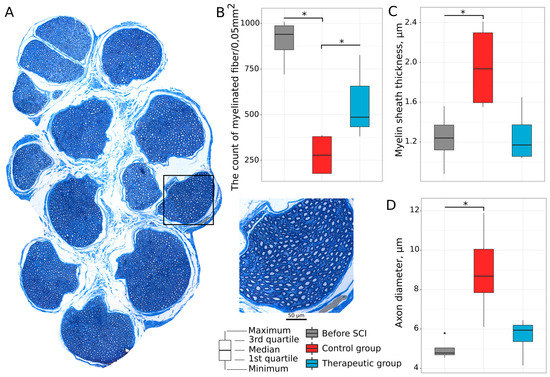 Preservation of the tibial nerve myelinated fibers in mini pigs 8 weeks after low thoracic spinal cord injury (SCI). (A) Semi-thin cross-section of the tibial nerve stained with methylene blue dye in an intact animal. (B) Number of the myelinated fibers. (C) Thickness of myelin sheath (μm) in the myelinated fibers. (D) Axon diameter (μm) of the myelinated fibers. Data are visualized using box plots, *—p < 0.05.