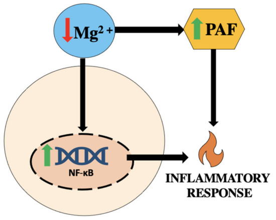 It has been suggested that Mg deficiency leads to an increase in PAF and PAF-like molecules [1,11]. PAF may be an indicator for the etiology of inflammatory conditions. Low-Mg environments can be a trigger that induces hypoxia and ischemia, which induces inflammatory responses such as the release of PAF [1,12]. Mg is involved in over 300 different enzymatic reactions and it has been suggested that Mg has an effect on nuclear factor-kappa B (NF-κB), a regulator of growth, differentiation, cell migration, and cell death as shown in Figure 2. It is also involved with inflammatory response and hypertension [13]. It has been seen that in environments with short-term Mg deficiency, there is an increase in NF-κB in cardiovascular tissues and vascular smooth muscle [1]. As previously stated, an increase in PAF and a decrease in Mg has been seen in pregnancies with hypertension and pre-eclampsia, and those with HELLP syndrome. It has been suggested that the link between Mg deficiency and the increasing circulating levels of PAF is the major trigger in development of these conditions.