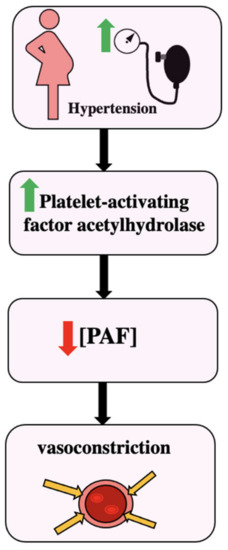 Decreased PAF levels as a result of increased platelet-activating factor acetylhydrolase activity was seen in pregnant patients with hypertension. It has been seen that in pregnant patients with normal blood pressure, the activity of the enzyme decreased to 35% [14]. In comparison to pregnant women with normal blood pressure, the activity of the enzyme in pregnant patients with hypertension was higher. Males had the highest PAF-acetyl hydrolase activity at 65 nmol × min−1 × mL−1 plasma, and normal pregnancies had the lowest PAF-acetyl hydrolase activity at 30 nmol × min−1 × mL−1 plasma. Non-pregnant women and pregnancy-induced hypertension had similar levels near 40 nmol × min−1 × mL−1 plasma [14]. Higher PAF acetylhydrolase activity results in a lower plasma PAF level, and ultimately a lower PAF level could result in vasoconstriction and hypertension, as seen in Figure 3.