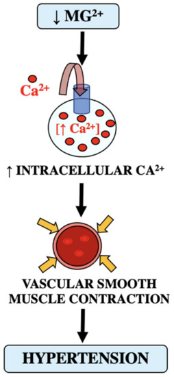 Evidence suggests a linkage between magnesium deficiency and hypertension described as an inverse relationship between intracellular magnesium concentration and blood pressure [15,16]. As stated before, magnesium regulates vascular muscle contraction and indirectly influences blood pressure regulation [15,17]. As shown in Figure 4, with decreased magnesium there is an increase in intracellular calcium, which results in increased vasoconstriction and hypertension. It has been seen that administering magnesium induces hypotension and vasodilation of blood vessels. In vascular smooth muscle cells, magnesium acts extracellularly by inhibiting the transmembrane calcium transport, which inhibits calcium entry causing a decrease in contractile actions; alternately, magnesium acts intracellularly as a calcium antagonist, which in turn modulates the vasoconstrictor action of the increased amount of calcium. There is a clear connection between magnesium levels and calcium in regards to vascular contractions, tone, and hypertension.