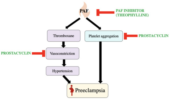In a study conducted by Rowland, Vermillion, and Roudebush to see the link between PAF and pre-eclampsia, it was seen that there were higher PAF concentrations in those with pre-eclampsia when compared to the pregnant group without pre-eclampsia and the non-pregnant group [22]. The PAF concentrations seen in the pregnancies with pre-eclampsia were higher by 35% when compared to pregnancies without pre-eclampsia. The PAF concentrations in the pregnancies with pre-eclampsia were also 29% higher compared to non-pregnant participants of the study. The findings from Rowland, Vermillion, and Roudebush are consistent with those of Benedetto et al. The study conducted by Bendedetto et al. also found that serum inhibitory activity of PAF was significantly lower in patients with pre-eclampsia [21]. This finding correlates with the increase in PAF. It has also been seen that there was an increase in PAF-mediated platelet aggregation in pregnancies with pre-eclampsia [22]. It has been found that in certain cases patients taking a PAF inhibitor such as theophylline have lower incidence of pre-eclampsia [23,24]. There was a reduction in the frequency of incidence and the severity of pre-eclampsia with use of anti-platelet treatments. As shown in Figure 5, prostacyclin has a role in inhibiting platelet aggregation and the levels in pregnancy are lower than those seen in non-pregnant individuals [25]. Analog prostacyclin is given as an anti-platelet treatment to vasodilate the blood vessels by increasing levels of cAMP to lower the frequency of pre-eclampsia [25,26].